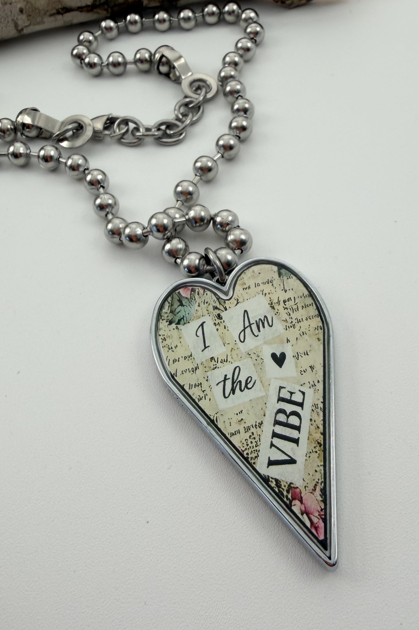 • A 2" long by 1-1 & 1/2" wide (including the stainless-steel jump ring) x 1/8" thick heart, hand resined, pendant.