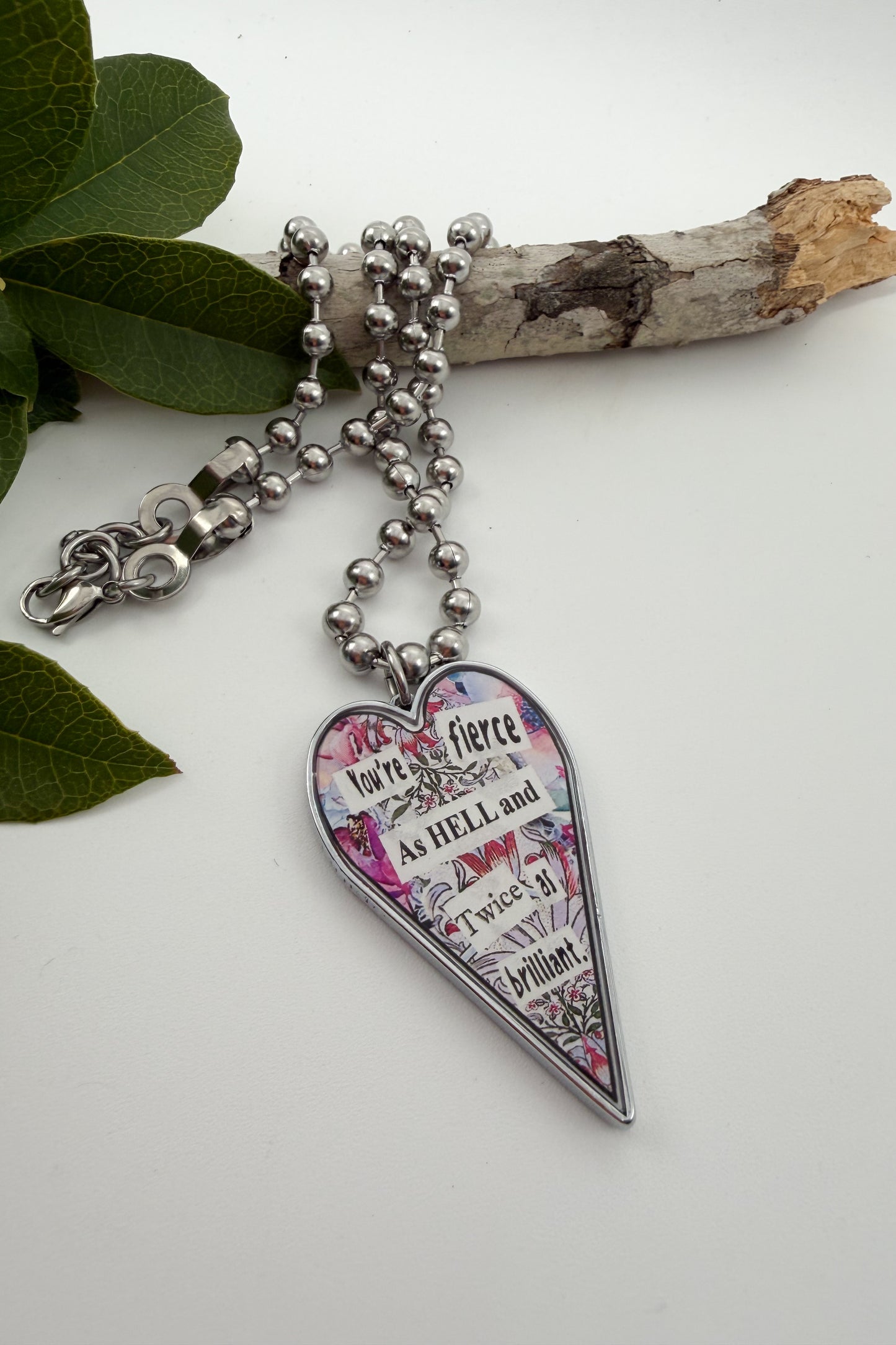 • A 2" long by 1-1 & 1/2" wide (including the stainless-steel jump ring) x 1/8" thick heart, hand resined, pendant.