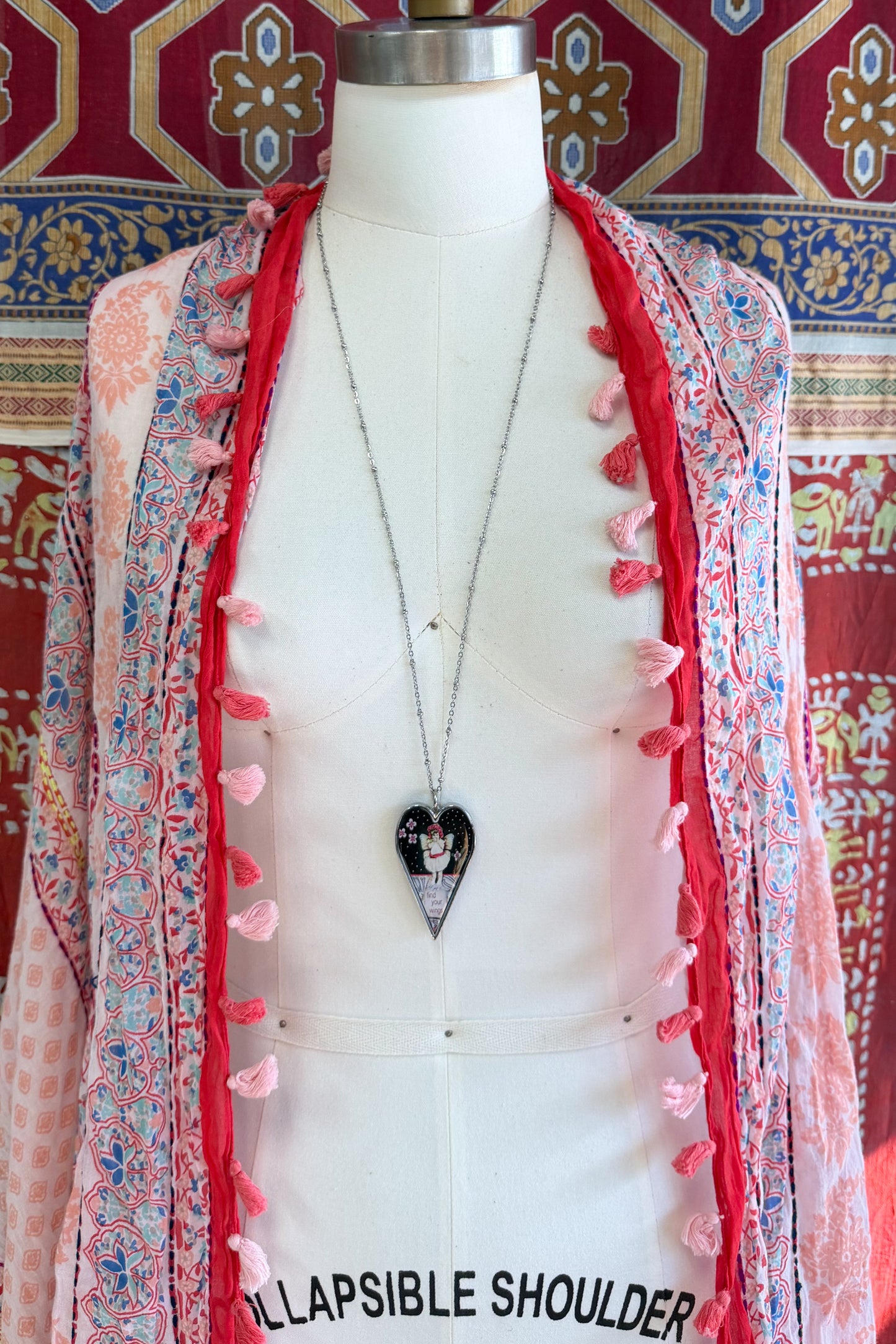 • A 2" long by 1-1 & 1/2" wide (including the stainless-steel jump ring) x 1/8" thick heart, hand resined, pendant.