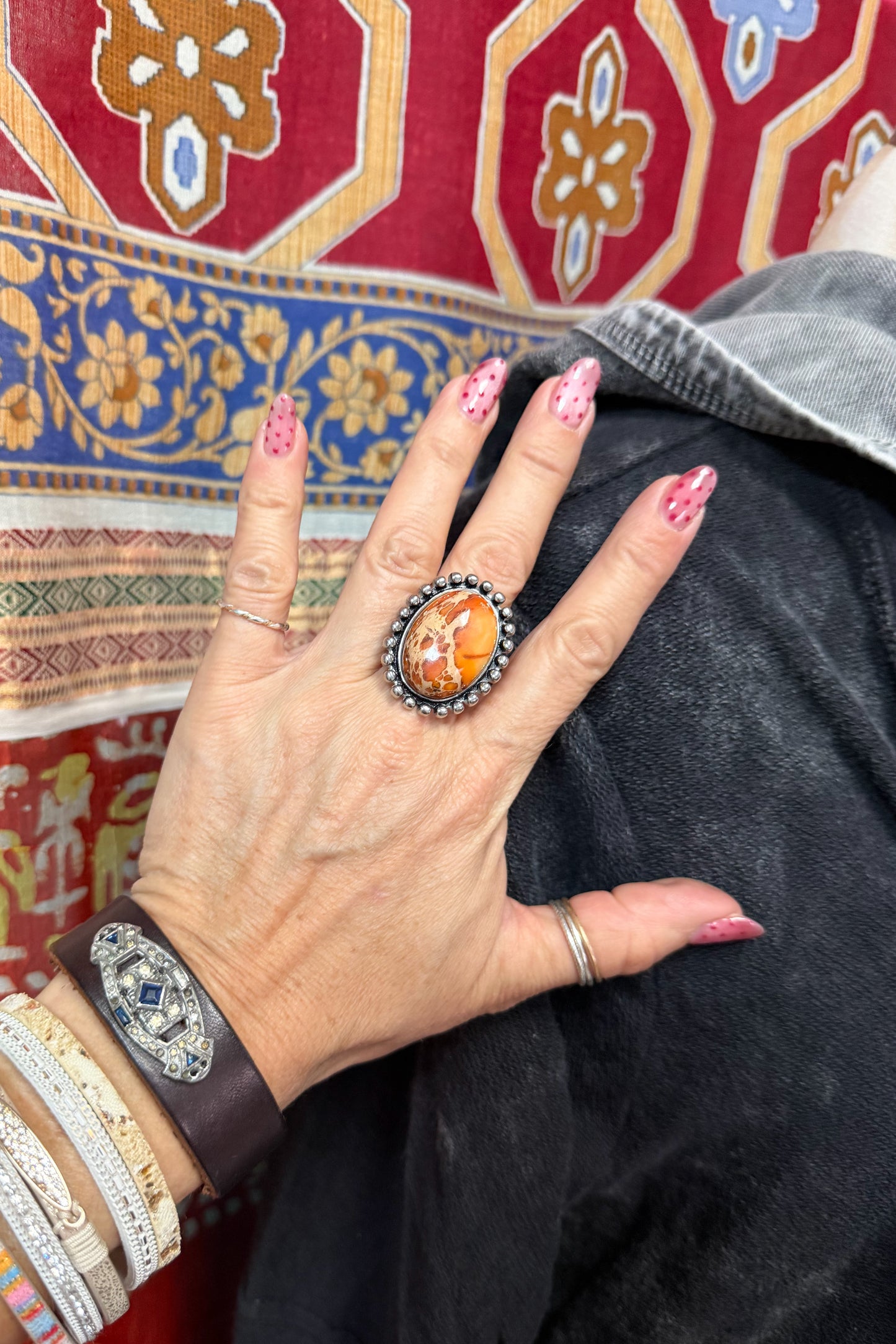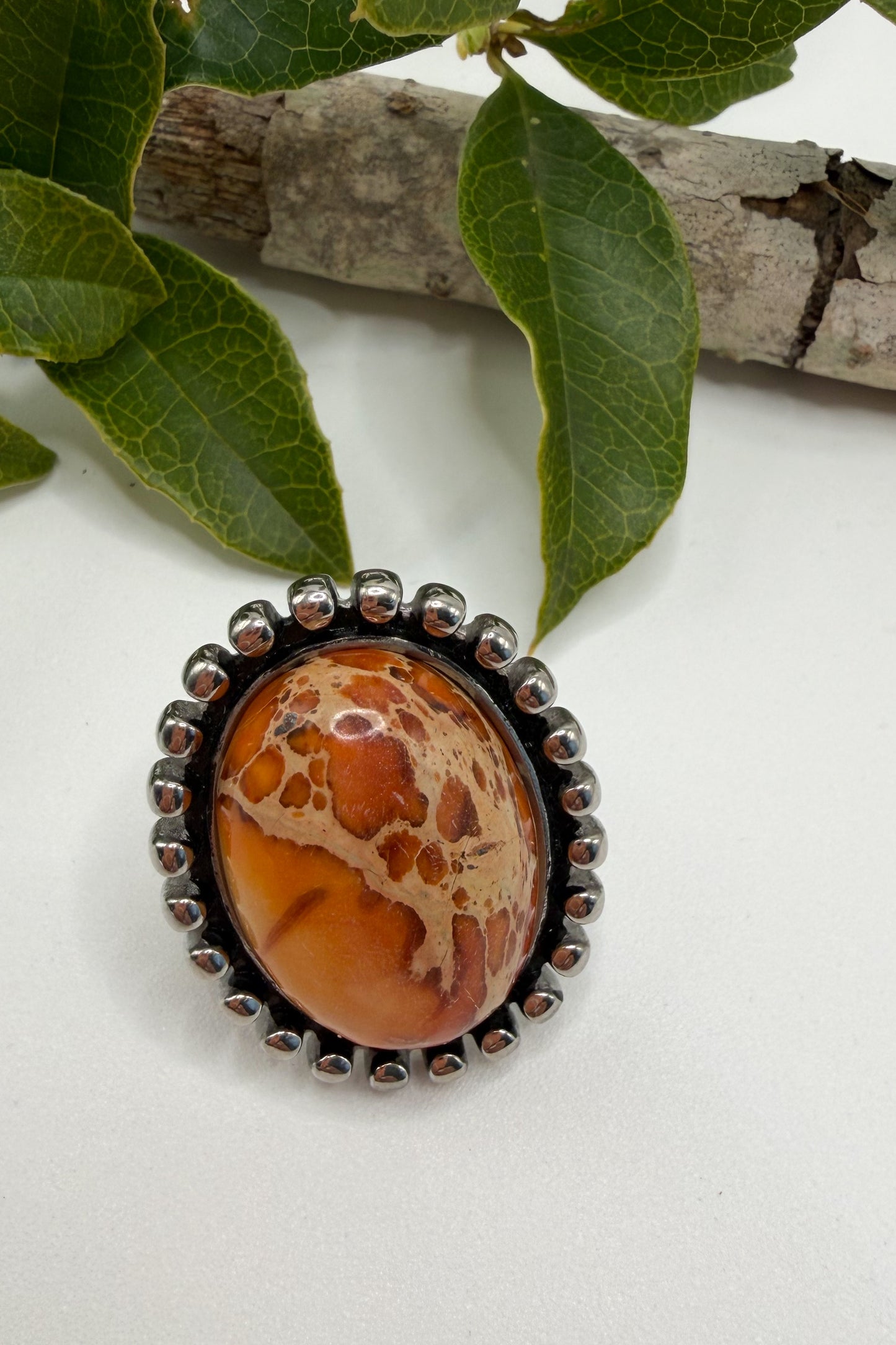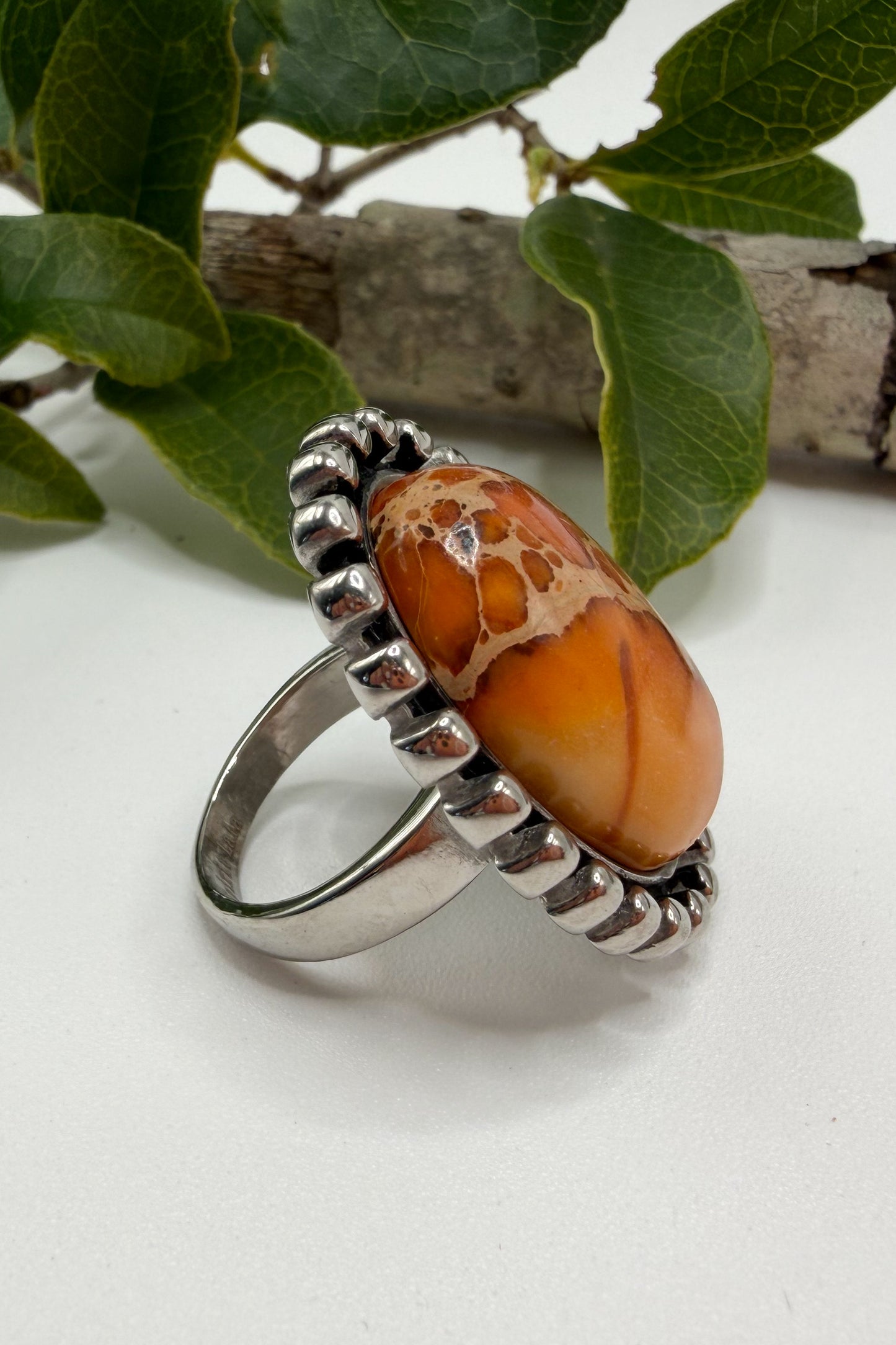 • An antique stainless steel setting and orange sunset stone center.