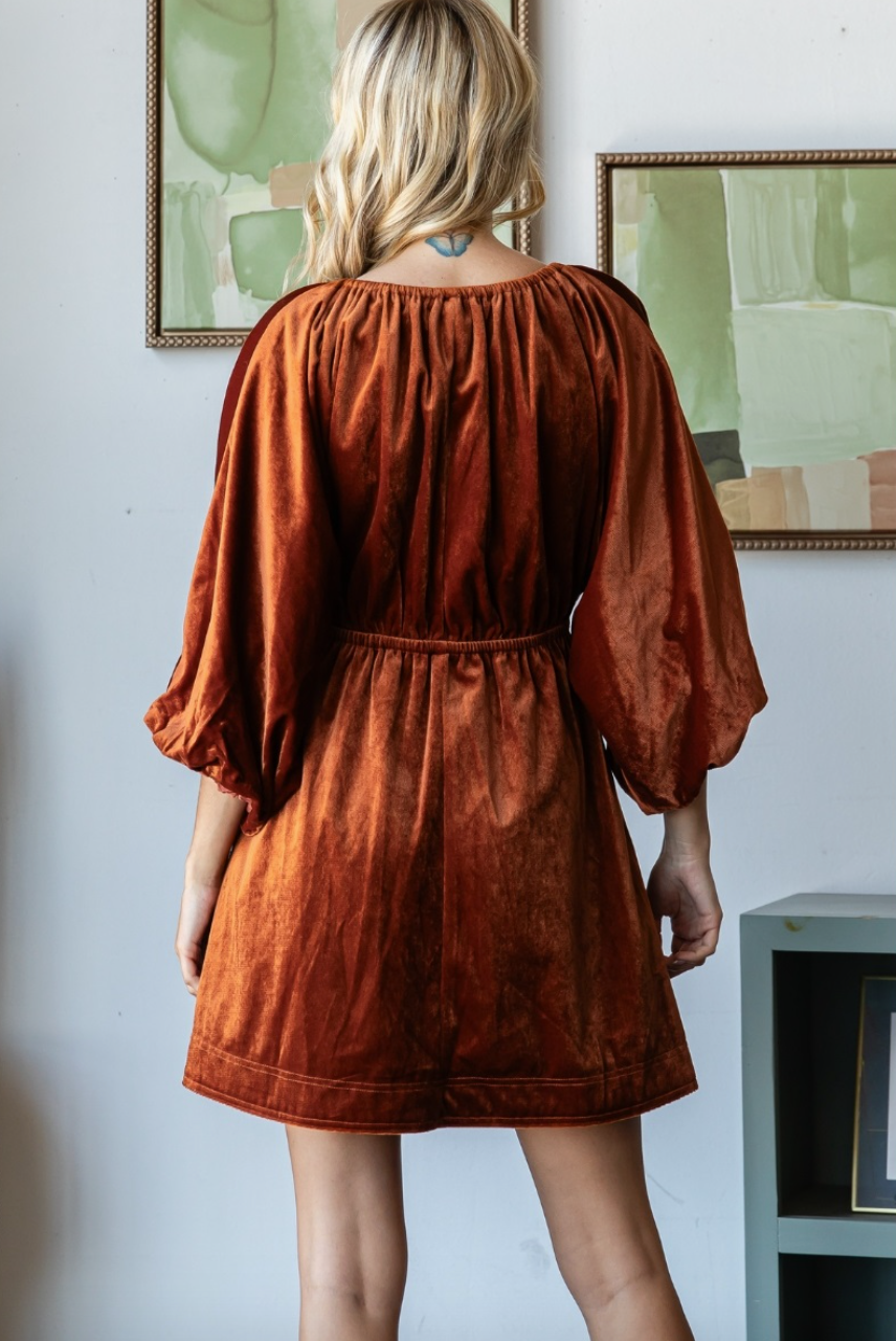 To maintain quality, this Valerie Velvet Puff Short Dress in Spicy is best when washed in cold water and line dried.